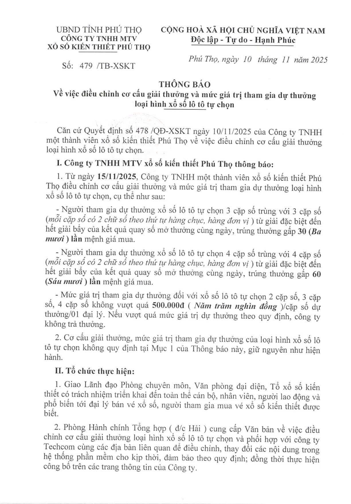 THÔNG BÁO VỀ VIỆC ĐIỀU CHỈNH CƠ CẤU GIẢI THƯỞNG LOẠI HÌNH XỔ SỐ LÔ TÔ TỰ CHỌN